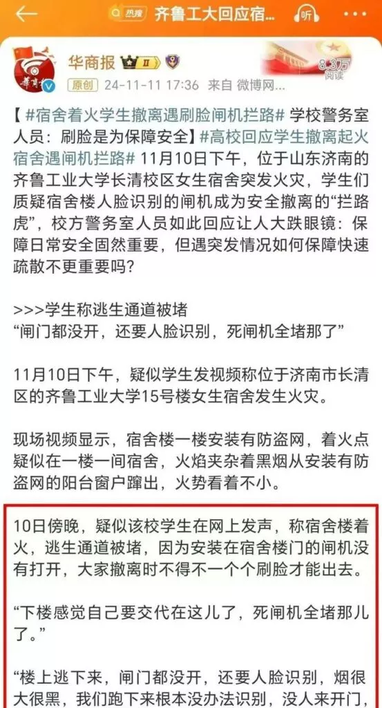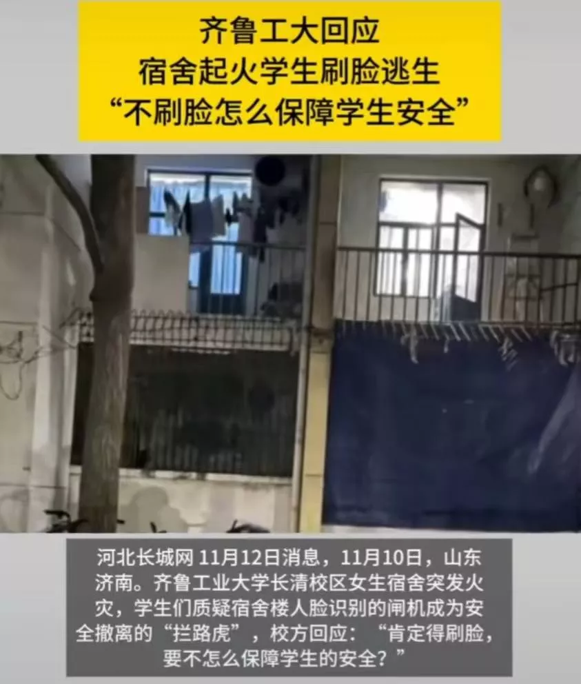 齐鲁工业大学女生宿舍发生了一起火灾,楼道内的闸机成为逃生的障碍。校方解释称,刷脸系统的设立是为了确保安全,必须进行身份验证才能进行管理。然而,值得庆幸的是这次火灾并不严重,否则怀着如此严重失职的态度,不知道会发生怎样的后果。