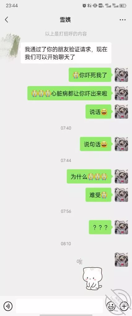 前天跟雪姨聊天聊到晚上十点左右雪姨就不理我了,我给雪姨发信息发了一晚上都没理我,我以为我说错了什么话啦,不理我了,等到上午十点了才回复我,说昨天不小心睡着啦,给我吓一身汗啊